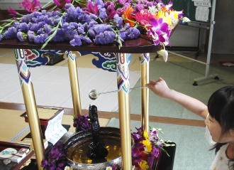 「花まつり」は「灌仏会(かんぶつえ)」とも言い、お釈迦さまのお像に甘茶をかけてお釈迦さまのご誕生をお祝いする行事です。