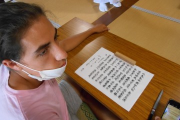 ・写経の際は、文字に自分の息がかからないように、マスクで口を覆う覆面瓠(ふくめんこ)をします。